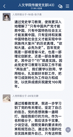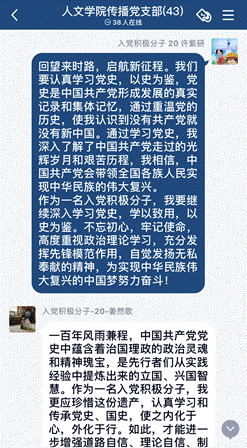 入党积极分子张子晨同学说:通过党史学习教育,使我更深入地理解了“只有中国共产党才能救中国,只有中国特色社会主义才能发展中国,只有坚持和发展中国特色社会主义才能实现中华民族伟大复兴”的历史真理。“欲知大道,必先为史”。百年党史既是一部艰苦奋斗史,也是一部理论创新史,还是一部自身建设史。其中这个“行”就是实践。因此党史学习教育与实际工作不能“两张皮”,我们要学以致用、学用相长,扎实做好本职工作,把学习成效转化为工作动力和成效,以优异成绩庆祝建党100周年。”