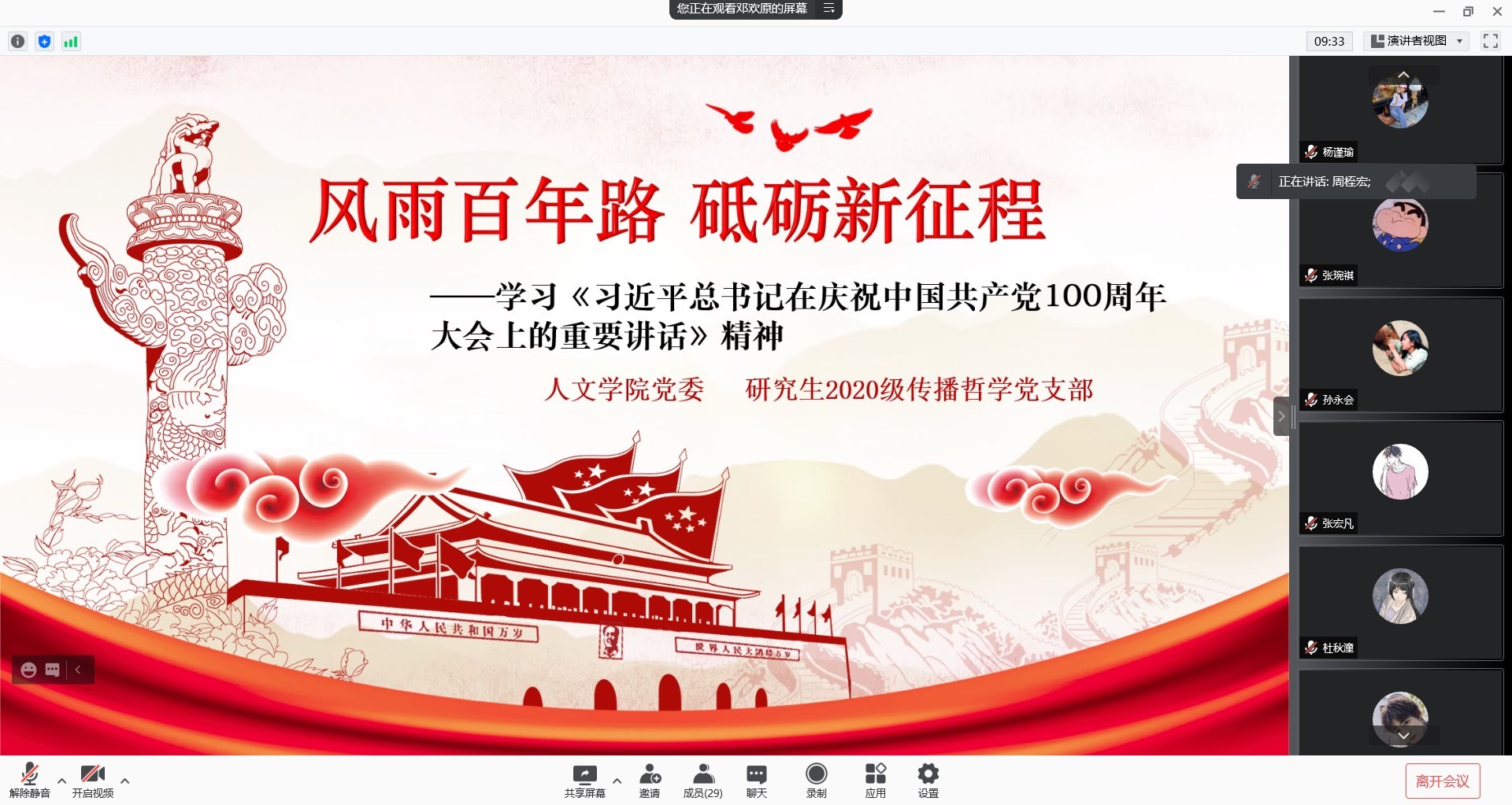 研究生2020级传播哲学党支部在线上组织开展学习《习近平总书记在庆祝中国共产党100周年大会上的重要讲话》精神活动。会议由周桎宏同志主持,邓欢原同志主讲,党支部全体成员参加。