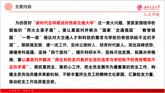 党委书记王顺洪在第十五次党代会上作的题为《踔厉奋发笃行不怠谱写中华民族伟大复兴的西南交大新篇章》工作报告。她提到,在大会中,王顺洪书记回顾总结了第十四次党代会以来学校建设所取得的成就,客观分析了学校发展过程中存在的不足,明确提出了未来五年学校高质量发展的实现途径。