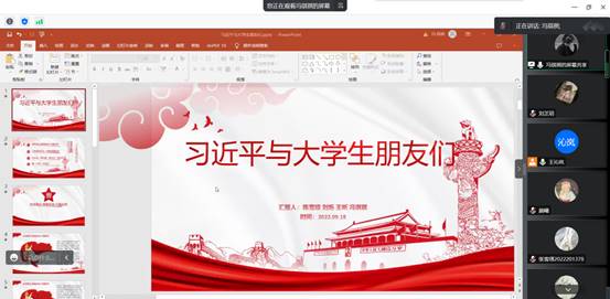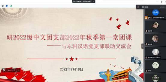 2022年9月18日晚20:00,本科汉语党支部联合研2022级中文团支部依托腾讯会议APP开展主题学习交流会。本次会议由王沁岚同志主持,共有两项议程,第一项为学习《温暖——习近平与大学生朋友们》的主题视频;第二项为支部成员分享、学习抗击疫情与抗震救灾的先进精神。会议现场纪律良好,本科汉语党支部与研2022级中文团支部全体成员参与此次专题学习活动。
