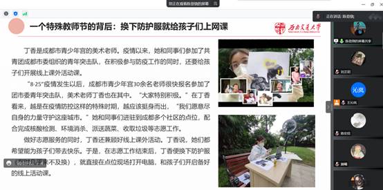 会议的第二部分,参会成员分享、学习抗击疫情与抗震救灾的先进精神。首先,颜曦同学分享师生做爱