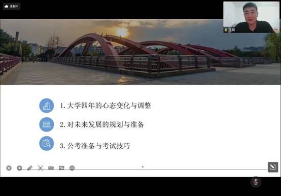 对于有意愿考公同学,王琦学长建议大家积极应聘学生干部,锻炼自身能力。积极参与到支部各项活动中,多沟通交流,如担任活动主讲人,为以后公考面试积累经验。大三就可以开始学习公考笔试内容行测与申论,尽可能在线下班学习以便效率最大化。此后,对于考试基本内容、各项时间线也做了详细讲解。