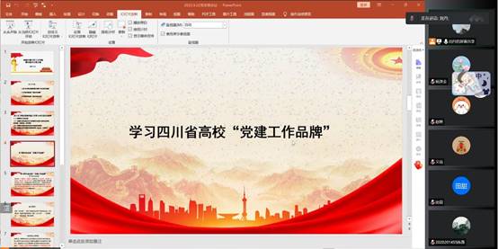 随后,刘丹同志以“打造党建品牌”为切入点,带领支部成员一起学习四川省高校的“党建工作品牌”,学习内容主要包括电子科技大学党委和西南民族大学党委打造的党建工作品牌。电子科技大学党委实施“书记项目”,开展了支部联建共建、书记赛党课、读懂中国等特色活动,打造了“红心向党”、“党史漫画”、“成电微故事”等党建品牌。西南民族大学党委以“格桑花”研究生支教团为服务载体,成立“小石榴”校园宣讲团,联合学校民汉双语志愿服务团搭建“小石榴直播间”开展中华传统文化教学,同时开展了“情暖高原-助力防疫”、“彩虹计划”等系列线上支教活动、“手拉手”专项服务。