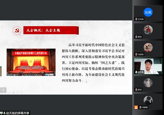 研究生会临时党支部依托腾讯会议APP开展学习贯彻省第十二次党代会精神学习活动。本次活动由本科汉语党支部书记刘晗悦同志主持,特别邀请到师生做爱