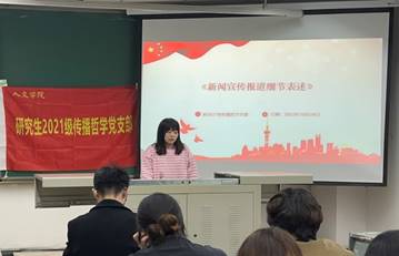 结合本支部党员包含新闻传播学专业的实际,支部宣传委员舒盼同志为同志们介绍了党建新闻写作注意事项。舒盼同志首先介绍了新闻宣传与报道的基本表述,指出需要在写好报道后仔细检查,避免出现语病和错别字;接着,针对党的二十大的具体学习内容,舒盼同志由表及里地为支部党员同志们介绍了在撰写新闻报道时应该注意的特定表述,包括入党誓词、精神表述、教育活动表述、会议表述、重要文件名表述等内容。