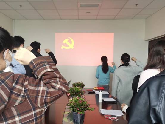 在胡红副院长的领誓下,在场全体党员立正姿势,举右手,握实拳,面向中国共产党党旗郑重宣誓。
