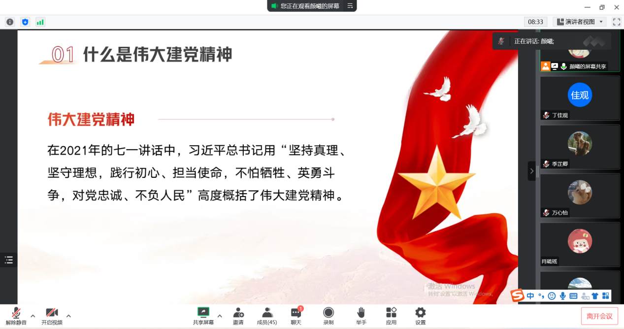 研2022级中文党支部联动研2022级传播哲学党支部,线上开展“筑牢思想根基,讲好党的故事”主题活动。此次活动由中文党支部负责汇报,内容为中国共产党人的精神谱系,重点学习伟大建党精神与脱贫攻坚精神。本次活动由万心怡同志主持,会议内纪律良好。