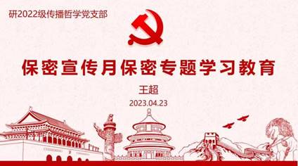 为适应新时代保密工作的需要,落实“保密宣传月”活动的文件精神,2023年4月23日下午15:30,研2022级传播哲学党支部于九里校区J4220教室进行保密安全学习,集中观看保密科普系列微视频。活动由研2022级传播哲学党支部书记王超主持。