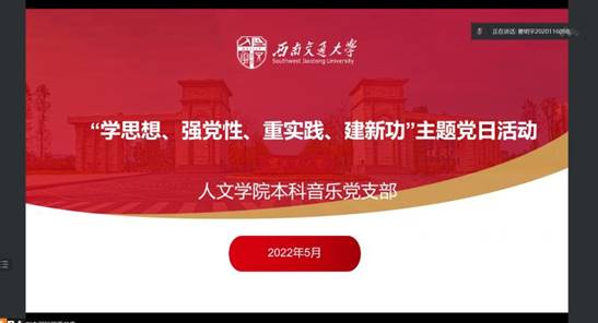 本科音乐党支部在腾讯会议开展“学思想、强党性、重实践、建新功”主题党日活动。本次学习由翟明宇、蔡佳薇、张泽屹、刘杰瑞担任主讲人,支部全体同志参与活动。