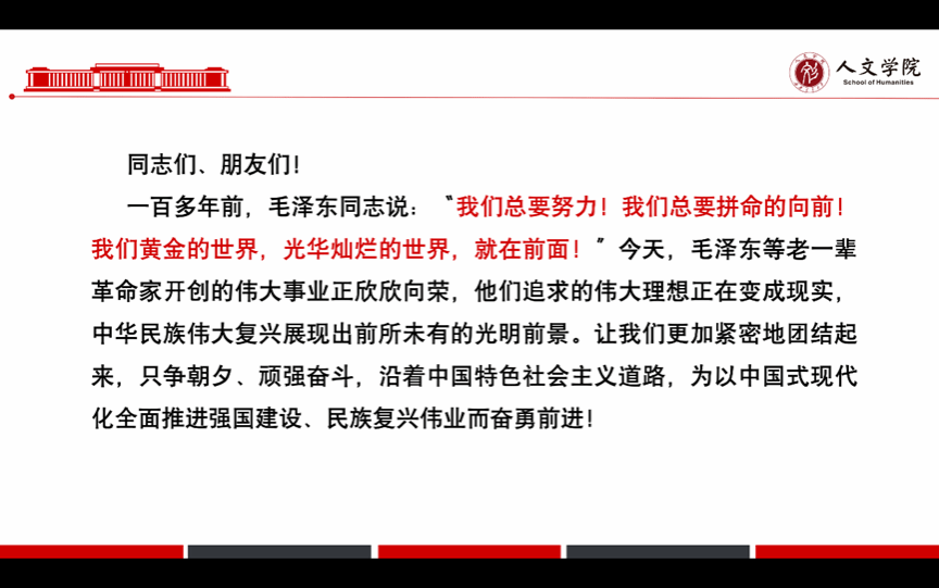 最后,谭雅丹同志讲到,习近平总书记指出,实现祖国完全统一是大势所趋、大义所在、民心所向,祖国必须统一,也必然统一。要推动构建人类命运共同体,坚定站在历史正确的一边、站在人类文明进步的一边,坚定维护国际关系基本准则。坚持经济全球化正确方向,高质量共建“一带一路”,积极参与全球治理体系改革和建设。今天,毛泽东等老一辈革命家开创的伟大事业正欣欣向荣,他们追求的伟大理想正在变成现实,中华民族伟大复兴展现出前所未有的光明前景。