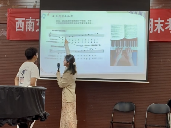 活动开始,郭佳同志介绍了多种音乐记谱方式,并对简谱的相关知识进行了深入的讲解。随后,王伊伊同志通过歌曲《本草纲目》引导大家进行气息练习,并以“吹纸条”比赛的方式检验学习成果。紧接着,王伊伊同志带领大家学习歌曲《成都》,使大家对歌唱技巧和发声方法有了更深刻的理解。活动最后,刘杰瑞同志演奏了手风琴曲《喀秋莎》,云怡嫚同志表演了古筝曲《青铜》,声乐表演专业的吴呈昊同志和朱雨萱同志分别演唱了舒曼声乐套曲《玫瑰百合鸽子太阳》和《千古绝唱》。