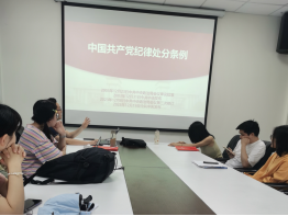 在学习《中国共产党纪律处分条例》的环节,支部成员从政治纪律、组织纪律、廉洁纪律、群众纪律、工作纪律、生活纪律等诸多方面,结合自身学习生活,谈体会谈心得,相互启发提高,大家一致认为,“人不以规矩则废,党不以规矩则乱”,在日常学习生活中,要增强纪律意识,增强担当意识,增强学习意识。以党纪学习教育为契机,每一位党员同志,都应加强党性修养,陶冶道德情操,主动肩负起新时代发展和民族复兴的历史使命。