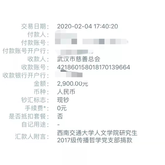 目前党支部的第一批2900元善款已经交付。党支部将继续关注武汉籍党员同志在生活、学习等方面的情况。
