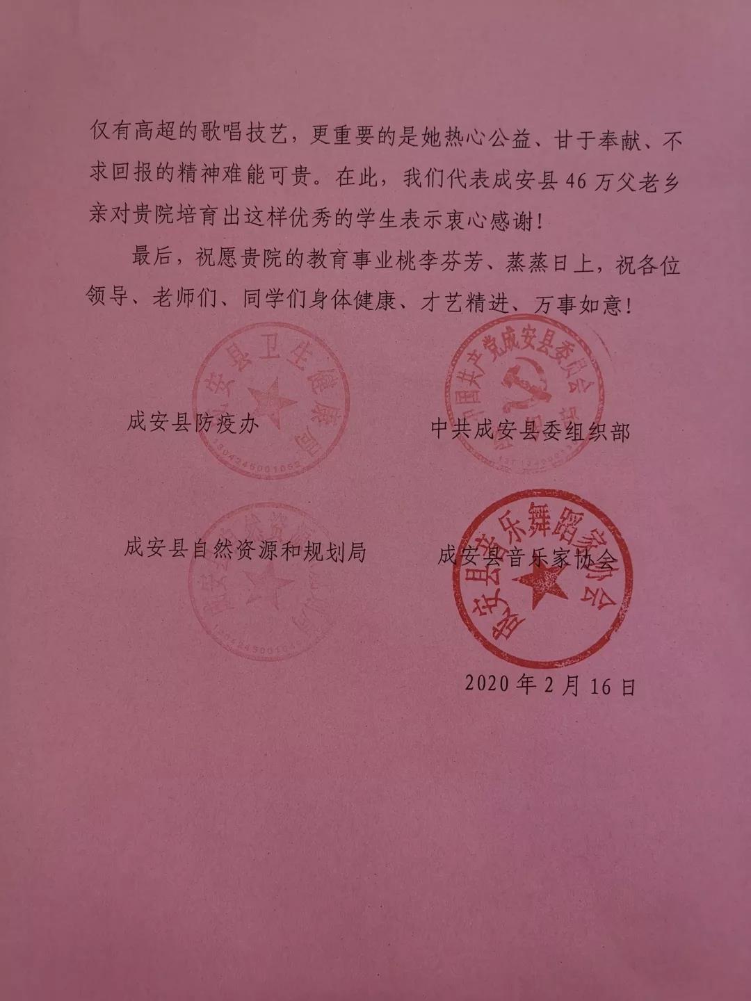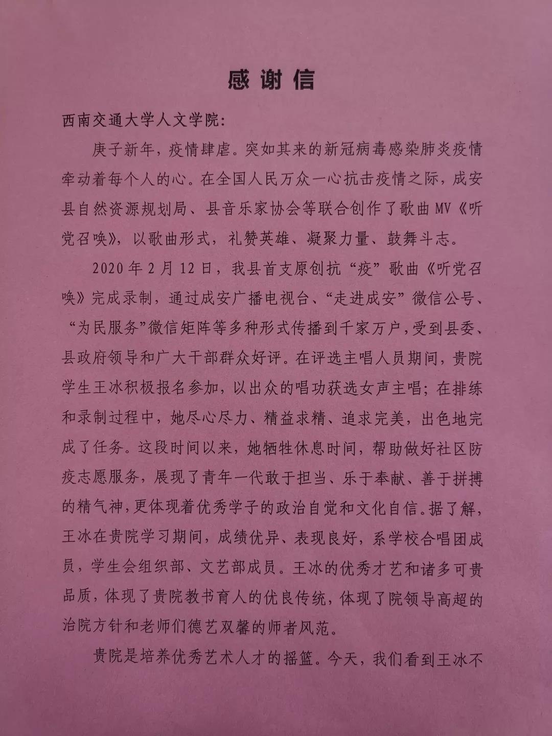 成安县防疫办、中共成安县委组织部、成安县自然资源和规划局、成安县音乐家协会等单位联合为王冰同学的倾情献唱发来感谢信,对王冰同学热心公益、甘于奉献、不求回报的奉献精神予以褒扬。