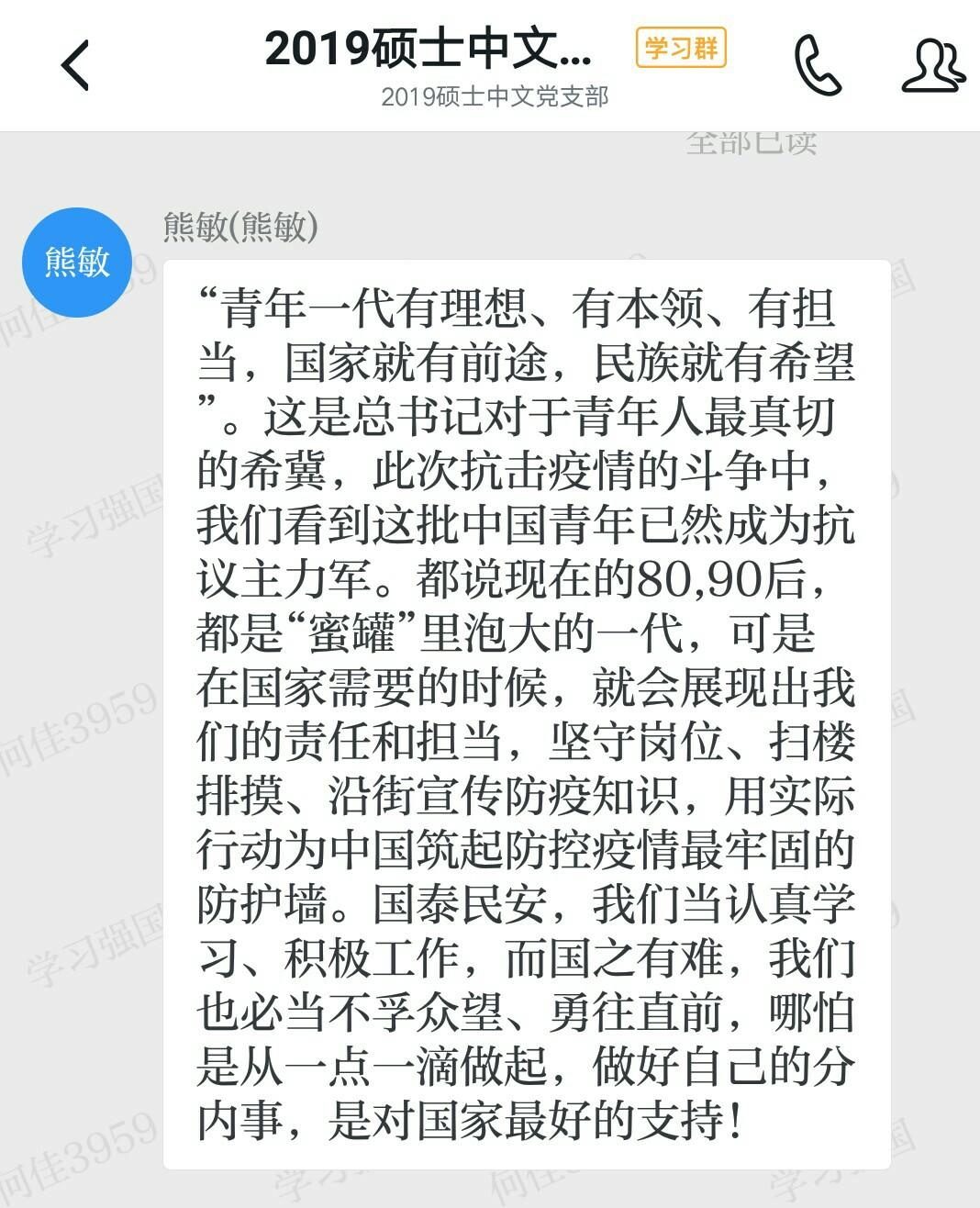 2020430日下午15:002019级硕士中文党支部在学习强国平台开展学习习近平总书记重要回信精神主题党日活动。