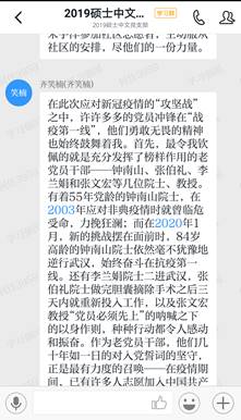 研究生2019级中文党支部在学习强国平台开展“四个一”主题党日活动。首先由支部书记为党员讲授疫情防控专题微党课,随后以“迎党的生日,讲战疫故事,悟初心使命”为主题开展组织生活会。