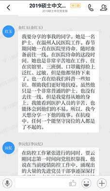 组织生活会上,党员回顾了疫情以来涌现的抗疫先进事迹,讲述了自己切身的体会。何佳同志讲述了自己邻镇村支部书记刘永柏用生命践行诺言的事迹,熊敏同志分享了自己社区一家五口齐上阵的故事,李国仪同志讲了“雨衣妹妹”为武汉医护人员做好后勤工作的暖心事迹,金红玉为我们讲述了自己护士同学在温州人民医院抗疫的故事,齐笑楠同志以钟南山院士为例,讲述了发挥榜样作用的党员干部故事。李沅忆同志从执法角度分享了贾云刚严格落实各项防控措施的故事。一件件贴近我们身边的抗疫事迹,让我们深刻感受到白衣天使们的无私奉献精神,基层干部们的平凡而伟大,先进党员的榜样力量,这样不畏艰难的精神始终支持鼓励着我们学生党员,科学防疫,坚定信念,做好自己岗位的事,与人民心连心,一起打赢疫情防控战。