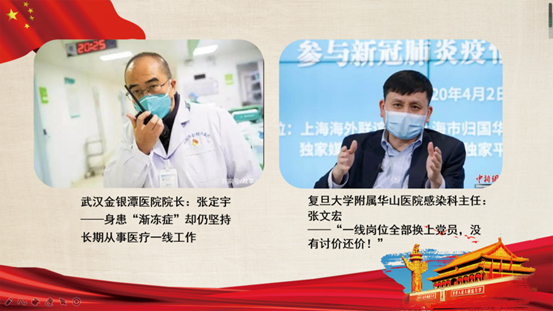 紧接着,栾潇同学分享了收集整理的支部外战疫故事。我校机械工程学院车辆工程专业2013届毕业生周泽民,毕业后入职中建三局。他在疫情期间火速驰援,主动申请成为第一批参与建设火神山医院的“青年突击队”队员,在十天十夜的奋战中,他积极建言献策,与同事铆足干劲,保证了工程进度。此外,栾潇同学还介绍了两位医务工作者,一位是武汉金银潭医院院长张定宇同志,他身患“渐冻症”却仍坚持长期从事医疗一线工作;另一位是复旦大学附属华山医院感染科主任张文宏同志,他“一线岗位全部换上党员,没有讨价还价!”的一番话充分彰显了共产党员的担当和责任意识。