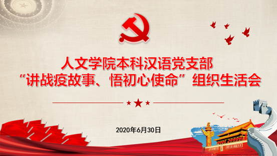 本科汉语党支部于6月30日10:30,利用“腾讯会议”平台顺利召开“讲战疫故事,悟初心使命”组织生活会。会议由本科汉语党支部书记刘晗悦同志主持,师生做爱