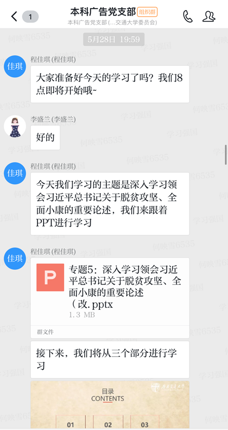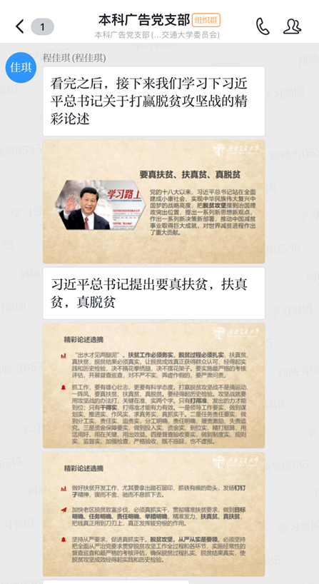 本科广告党支部召开第十四周线上主题学习,深入学习习近平总书记关于脱贫攻坚、全面小康的重要论述。本次学习由程佳琪同学主持,主要围绕“学习要求”“习近平谈打赢脱贫攻坚战”“习近平赴陕西考察与扶贫”等三方面展开。