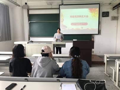 首先进行的是支部党员大会,会议内容为“预备党员转正”。会议严格按照预备党员转正流程进行,预备党员池茜同志就自己一年预备期的表现情况做出了汇报。池茜同志言辞恳切地表达了自己想要加入党组织的愿望,希望得到党组织的接纳,并表示在今后的工作与学习中将努力提高为人民服务的本领,积极帮助他人,践行社会主义核心价值观,刻苦学习,认真完成每一项工作,努力做到最好,以更加严格的标准要求自己,不断向做一名合格共产党员的目标靠拢,发挥共产党员的先锋模范作用,做到全心全意为人民服务。随后,由池茜同志的入党介绍人李盛兰同志对其作出评价并表态。后经与会正式党员的投票表决,一致通过其转正申请,同意池茜同志成为正式党员。大会决议将上报师生做爱