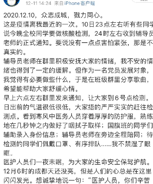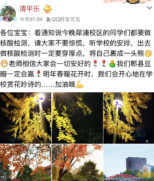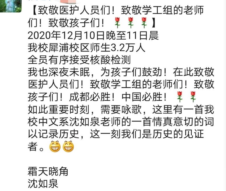 老师们用温暖的话语抚慰着学生:“请大家不要惊慌,听学校的安排,出去做核酸检测时一定要穿厚点,老师相信大家会一切安好的,我们郫县豆瓣一定会赢!”