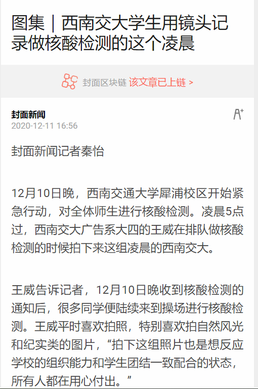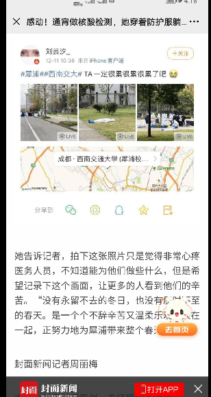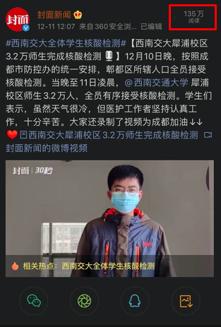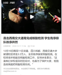 就在核酸检测完成的这个上午,国内十大最具影响力主流媒体新闻客户端“封面新闻”APP连发两条视频新闻:“连夜做完核酸检测后西南交大学生录制视频为成都加油”“直击西南交大通宵完成核酸检测学生有序排队秩序井然”。在“封面新闻”官方微博的推送中,第一条视频阅读量持续攀升,不到3小时就突破了140万。