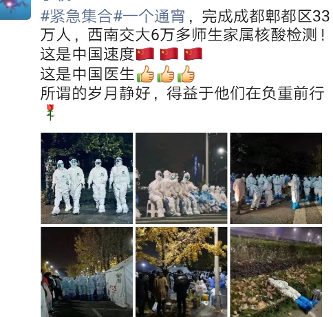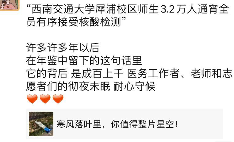 师生在成都市防控办和学校的统一部署下,全员有序进行核酸检测。这难忘的一晚,看到四面八方前来支援的医护人员以落叶为被、寒衣为枕,坚守岗位、彻夜奋战,师生们深受感动。这难忘的一晚,师生做爱