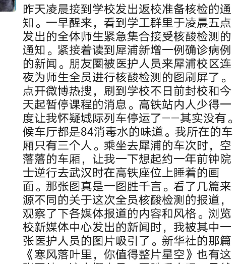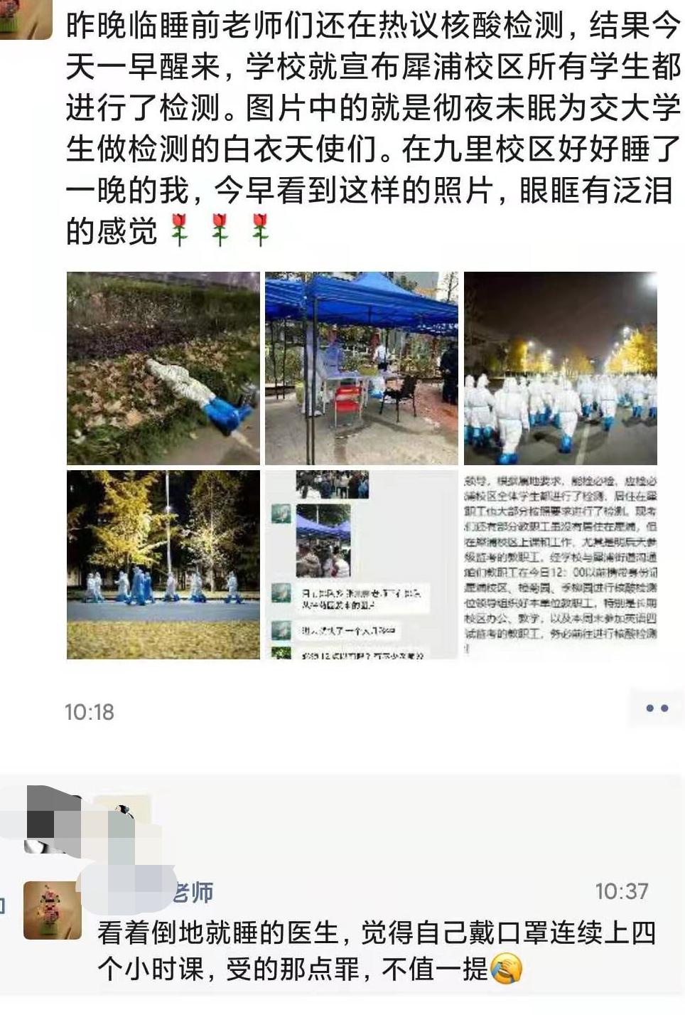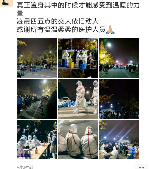 更多的人文师生在朋友圈、微信群里分享着医护人员的坚守、志愿者的暖心、辅导员的辛劳、学校的有序、组织的有力,以及,这一切汇成的,交大里的真情。