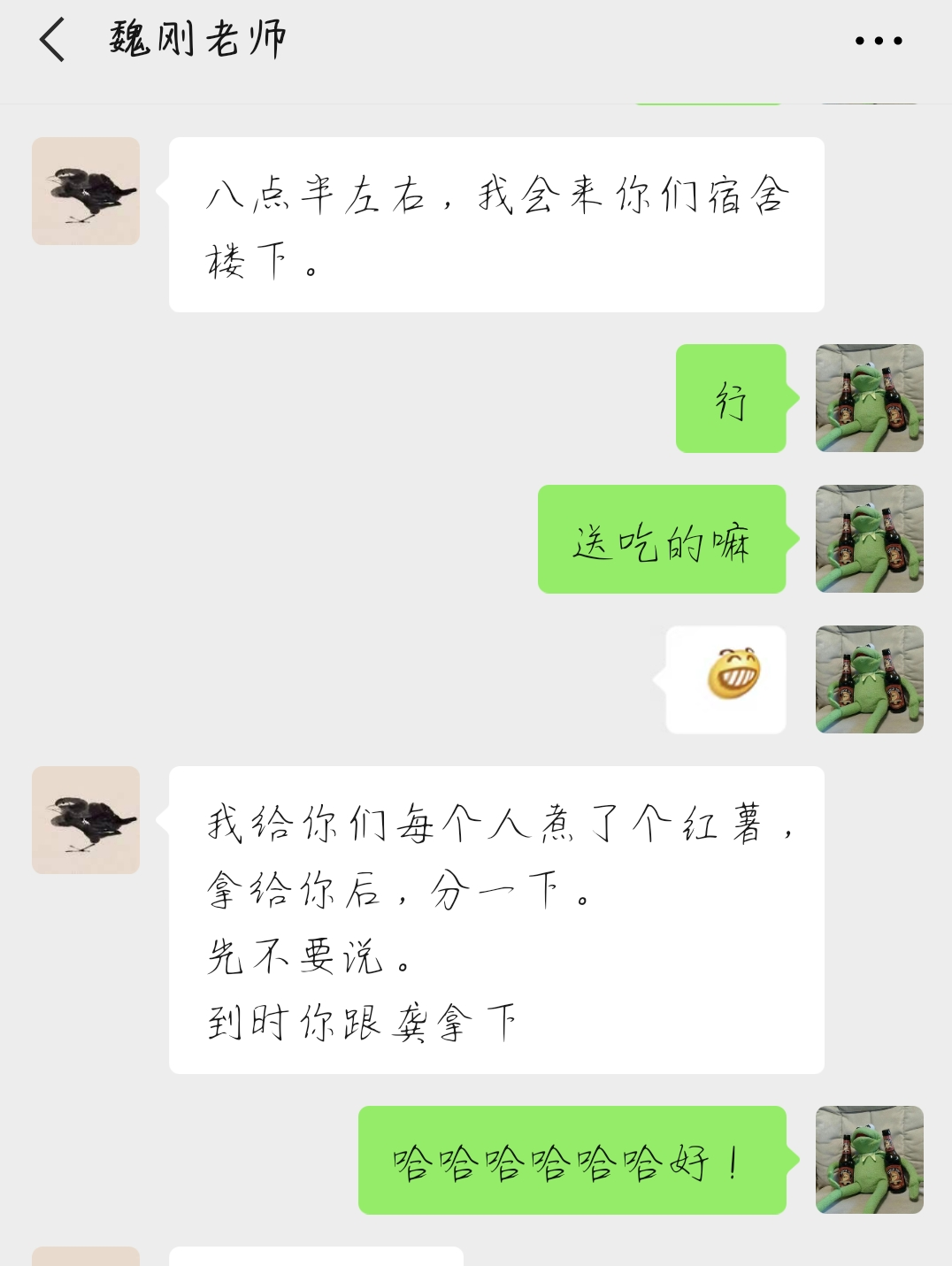 在这个不寻常的夜晚,2019级汉语言3班的同学们收到了几大袋特别的礼物:热腾腾的煮红薯。这是他们的班导师、中文系党员教师魏刚亲自煮好送来的最为朴实的礼物。