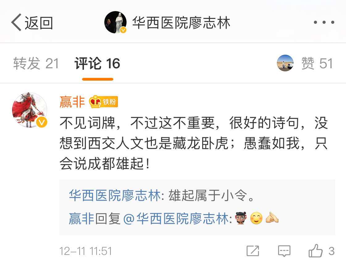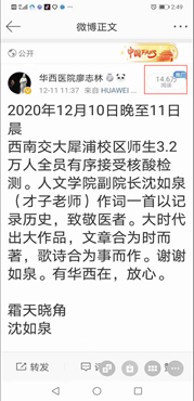 官方微博里,在华西医院“大V”、党委宣传统战部廖志林部长的微博里,流传着这样两首即兴创作的“献给最美逆行者”的诗: