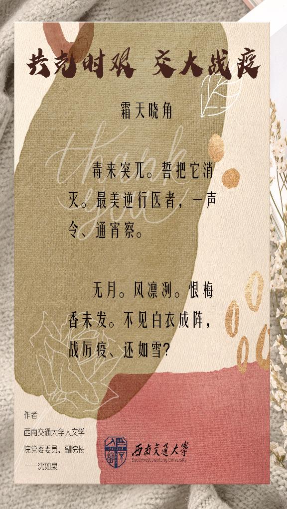 学院党委委员、副院长、中文系党员教师沈如泉副教授写道:“霜天晓角 毒来突兀。誓把它消灭。最美逆行医者,一声令、通宵察。无月。风凛冽。恨梅香未发。不见白衣成阵,战厉疫、还如雪?”