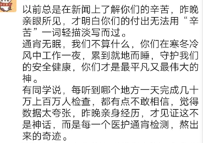 大爱无疆,人文深情。向白衣执甲的医护人员致敬,向这一夜认真有序做核酸检测的师生们致敬。