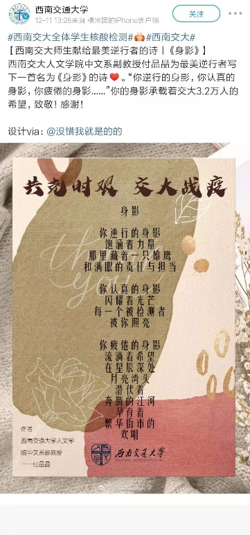学院工会主席、交大九三学社基础支社副主委、中文系副教授付品晶写道:“身影 你逆行的身影/饱涵着力量/那里藏着一只雄鹰/和满眼的责任与担当/你认真的身影/闪耀着光芒/每一个被检测者/被你照亮/你疲倦的身影/流淌着希望/在星辰深处/月亮湾头/潜伏着/奔腾的江河/孕育着/繁华街市的/欢唱”