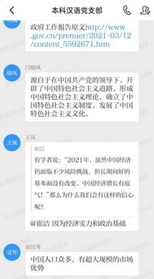 本科汉语党支部依托“学习强国”APP,进行习近平总书记在全国劳动模范和先进工作者表彰大会上的讲话精神学习和2021年政府工作报告的解读。通过本次线上讨论,支部同志们明确了劳模精神的内涵,并从经济政策、民生福祉等层面深刻认识了政府工作报告。