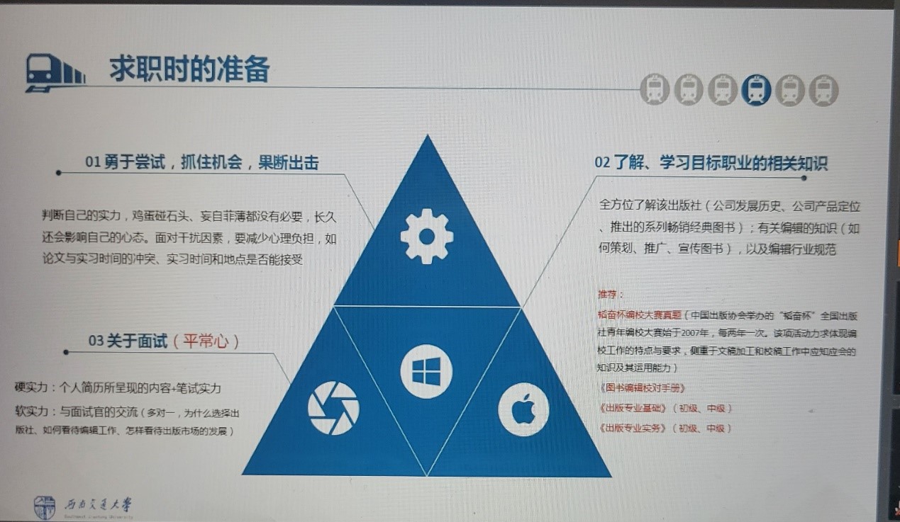 张金凤主要从入职高校的途径、选择高校的条件、高校考试流程等三个方面分享了求职经历,详细介绍了入职高校的岗位设计、报名信息获取以及考试题型,并分享了相关的图书资料。王蓉主要从确定就业方向、收集招聘信息渠道、就业准备以及蓉漂人才荟招聘流程介绍了入职公立中学语文老师的经历,提醒学弟学妹做好就业前期准备,关注人才引进信息,多参加模拟面试,提升求职竞争力。