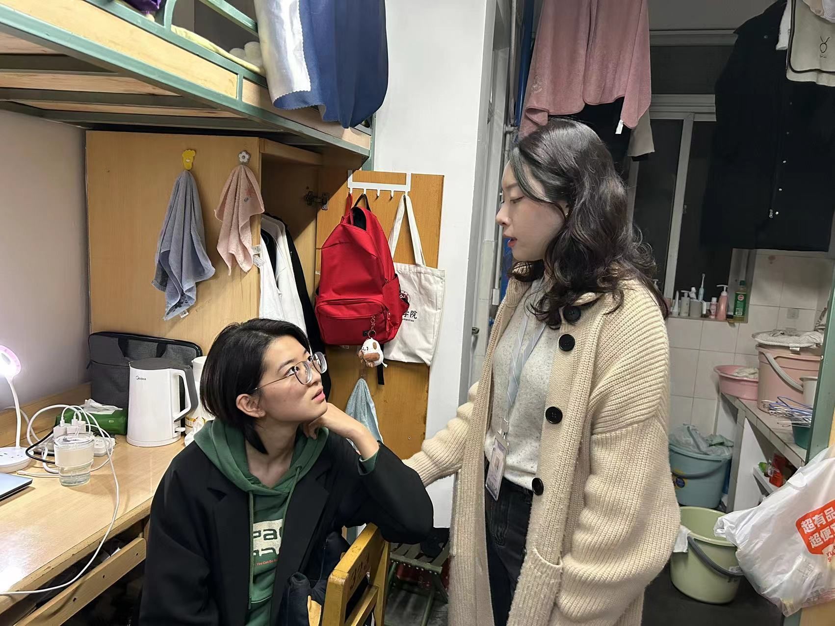 卢琴、万心怡老师前往九里校区研究生宿舍进行走访。卢琴老师询问了学生的毕业论文中期检查情况,并关心了大家的身体情况,提醒学生预防流感。万心怡老师深入研究生宿舍,了解了学生的实习情况以及开题情况,提醒大家注意时间安排。