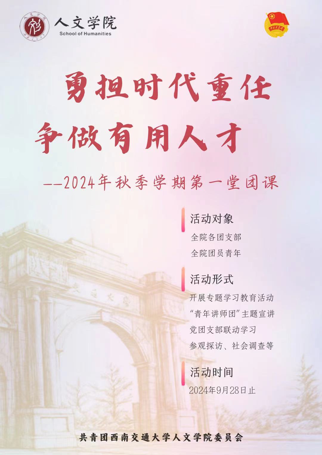 团委开展“勇担时代重任,争做有用人才”2024年秋季学期第一堂团课通知如下。