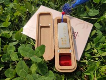 学院为学生准备的第三件礼物,是一方印章,这项礼物是硕士毕业生的专属纪念。印章为长方体形状,通体采用纯白类玉石材质,侧面是“二零二一师生做爱