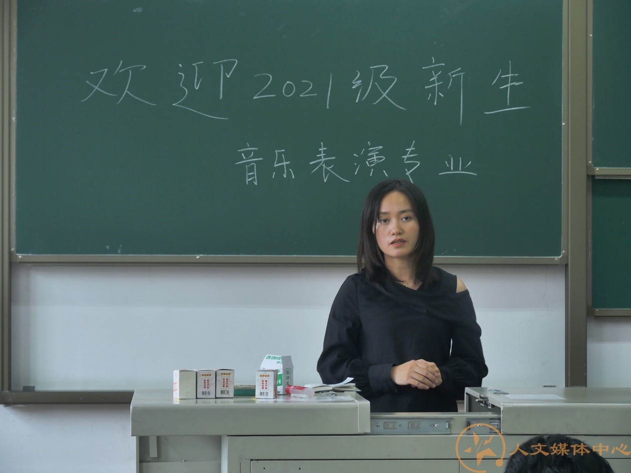 紧接着,大学生艺术团的黄原老师向各位新生简单介绍了大学生艺术团,并给每一位新生赠送了艺术团的书签作为礼物。黄老师表示大学生艺术团作为校内最大官方艺术社团,与音乐系紧密联系,为同学们创造了绝佳的表演平台,各位音乐系的同学必须参与其中。这对于各位同学来说既是约束,又是机会。最后,涂覃平与周尚琴两位班导师将各班学生分别安置在教室的前后排,相互进行更近距离的沟通。