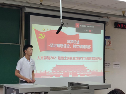 会议第三项是由党支书刘凯杰就“筑梦研途”—坚定理想信念、树立爱国情怀这一主题带领同学们进行学习。期间党支书带领同学齐唱红歌《没有共产党就没有新中国》,并请同学们浅谈了自己对党和党组织的认识。其次,深入学习贯彻习近平总书记在庆祝中国共产党成立100周年大会上的重要讲话精神,以党史学习教育为契机,与同学们共同观看习近平总书记的讲话视频,帮助研究生厚植家国情怀,补足新生的精神之钙。之后为同学们仔细讲解了申请入党的具体流程,最后同学们齐唱《国际歌》。