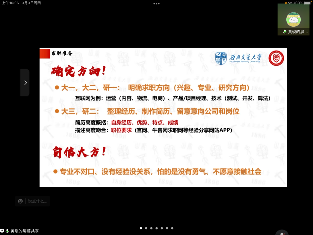第三位分享的是签约成都今日头条的交运学院研究生田丹琳。她首先将自己在求职过程中所走的弯路作为教训,让同学引以为戒;随后建议同学们在选择职业之前一定要充分了解各类岗位的相关讯息,在投递简历时要讲求策略。并且针对不同的职业面试,田丹妮学姐也给出了不同的面试建议。