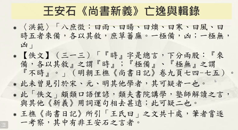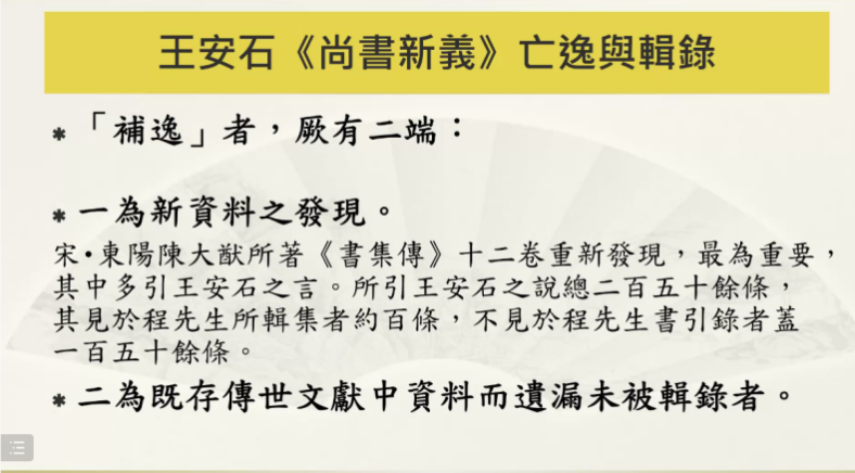随后,蔡根祥教授介绍了“王安石《尚书新义》亡逸与辑录”的具体内容,列举“补逸”的例子,详细讲述了辑录工作的成果。蔡教授指出,辑补的过程实际也是校勘的过程,对于许多古籍资料,我们要用怀疑的眼光去看待,用严谨的态度去研究。
