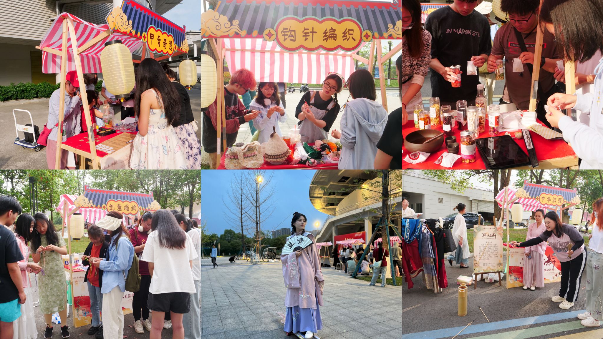 在传统文化集市展示与体验现场,设置糖画、蜀绣、剪纸、脸谱、捏面人、蒲草编织、漆画团扇和创意绳编等非遗项目,以及甲骨奇遇、汉服、书画、茶艺、彩绘、香囊、钩针编织、国风发饰、国风手串、射艺和国潮滑板等国风、古风和民俗文化项目,共同为师生们呈现了一场丰富多彩的文化盛宴。