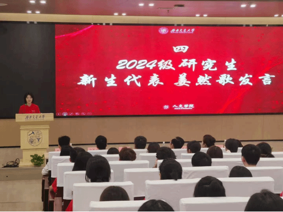 研究生新生代表姜然歌同学发言,希望同学们珍惜学院的优势资源与广阔舞台,以专业为基、理想为义,肩负人文学子的使命,积蓄力量,勇敢逐梦,追寻无限可能的未来