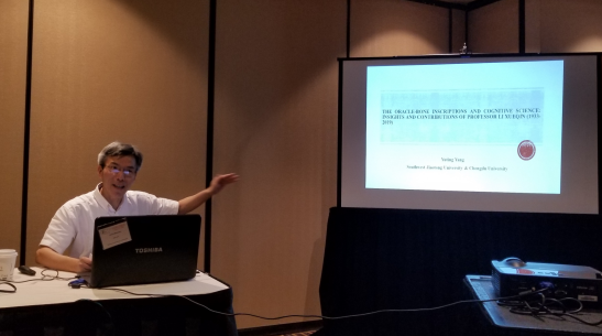 中文系博士生杨煜婷的会议论文“The Oracle-Bone Inscriptions and Cognitive Science: Insights and Contributions of Professor Li Xueqin (1933-2019)”,对已故国学大师、著名古文字学家李学勤先生的甲骨文研究与认知科学的关系,作了首次探讨。杨煜婷认为,李学勤先生以为用商、周甲骨文等商、周古文字的知识去考释更早的文字或符号,只能是探索性的试验,而早期符号向文字的演变,应该与认知科学相结合的观点,在甲骨文等古文字研究中具有革命性的意义,对于认知语言学尤其是认知语义学的研究,也有着重要的启示。杨煜婷的论文由邢文教授代为宣讲。邢文教授的论文“Cognitive Paleography and Cognitive Oracle-Bone Studies”论述了认知古文字学与认知甲骨学的关系,以及认知甲骨学的研究对象与内容方法等,并列举了生动的甲骨文字例加以解说,与西方学者作了饶有趣味的探讨。