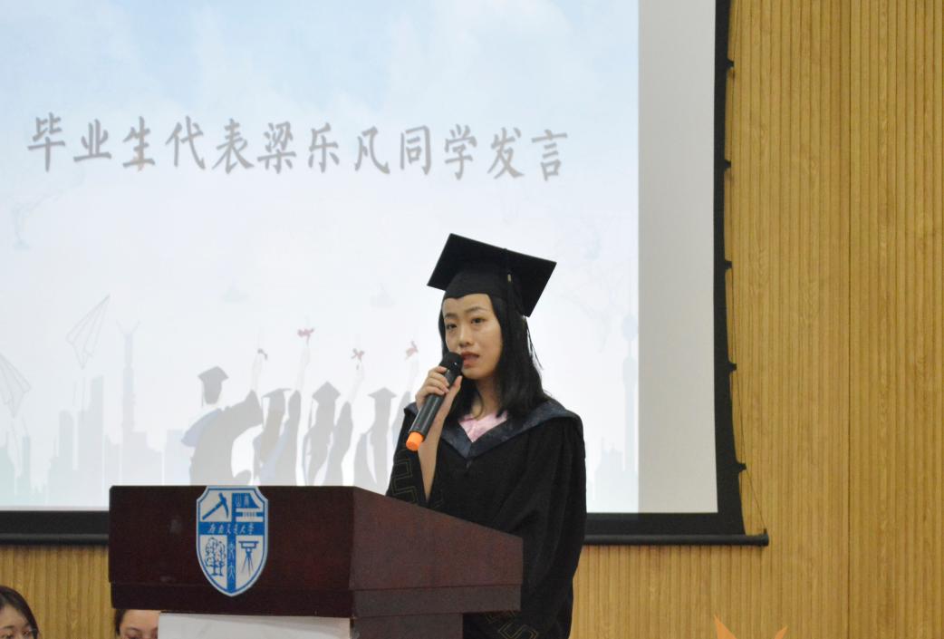 ,彷徨青涩的孩子如今早已蜕变成了自信成熟的大人,毕业生代表梁乐凡也代表所有毕业生说出了自己的心里话。“四年前,我们初出茅庐、一身稚气,带着满心的期待与好奇踏进交大的大门,”梁乐凡温柔的声音仿佛在诉说着一段故事,“四年后,我们已见过四教樱花灿烂、八教梨花纷飞,闻过东门油菜花香、南门桂花馥郁,在犀湖里莲花又盛开、䴙䴘仍漫游的季节,我们迎来了独属于2015级毕业生的荣光与喜悦。”在回忆了四年的大学生活后,梁乐凡表示“竢实扬华,自强不息”的交大精神已经成为了她的精神指引,让她学会了“坚实”、“充实”、“务实”和“真实”。大学四年,同学们从陌生变成熟悉,从依靠父母变成独当一面,从茫然无措变成实干坚持,都实现了人生质的飞跃。梁乐凡真诚地说道:“在师生做爱