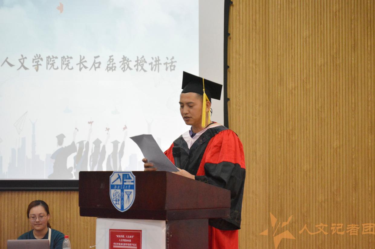 院长石磊发表讲话发言。在对大家表示了祝福后,石磊院长提出以学院四个学科专业相关的四句话与大家共勉。石磊院长希望大家可以永葆文学的少年气、新闻的侠义气、哲学的思辨性与音乐的灵动性。石磊院长引用了去年毕业典礼中余夏云老师的致辞,希望大家对理想与事业始终保持热情,尽管现实与理想会有不同,却依然不忘初心,永葆少年气;在侠义气上,石磊院长借用了新闻真实性的要素,希望大家可以时刻探寻事实,探索真相,不被浮华所迷惑,始终保持朴素之心;在思辨性上,“天法地、地法人、人法道、道法自然”石磊院长如是说。他希望同学能用辩证的眼光看待问题,能够探究事物的规律与本质,拥有一双慧眼;在灵动性上,他希望同学们不被现实所打倒,尽管遇到困难,也可以和诗而歌,简单生活。最后,石磊院长引用桂富强书记作词的《犀安路999号》做结:犀安路上的夜,满目星辰,到处都是当初的光景,天还没有亮,又要启程,告诉我,你也在这里等。