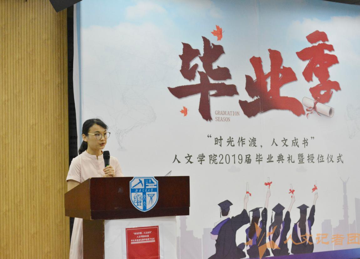 除了毕业生的肺腑之言,老师们也有很多话想说。教师代表、传播系张诗婷老师风趣幽默地说道:“我见过带珍珠耳环的强哥表情包、大家如果不相信大学是所整容所的话,刷一刷朋友圈就信了”等等,引得毕业生们阵阵发笑。张老师还对同学们提出了几点期许,她希望同学们能够成为内心强大的人,始终以学习者的姿态对待人、事、物,尽管成功的路上会经历很多磨难,但她相信同学们可以磨练心性,能动也能静,能屈也能申,能微笑也能痛哭。最后,张老师微笑着说:“祝愿同学们前程似锦,征途666!”