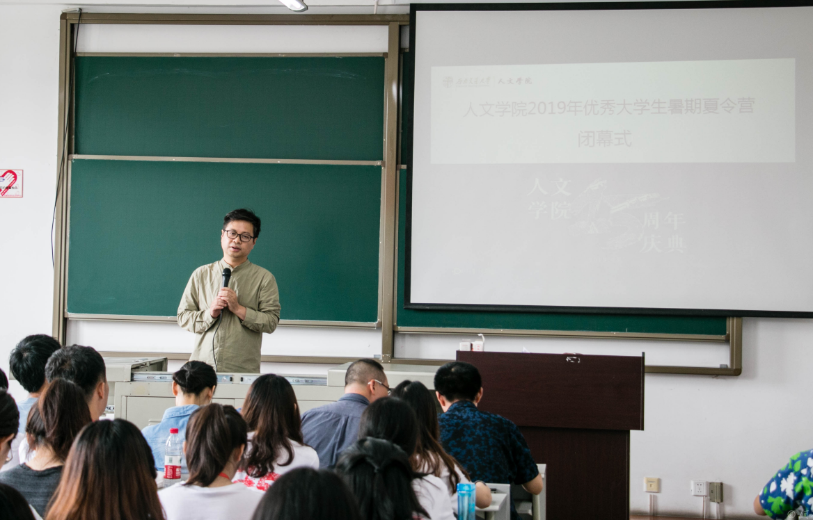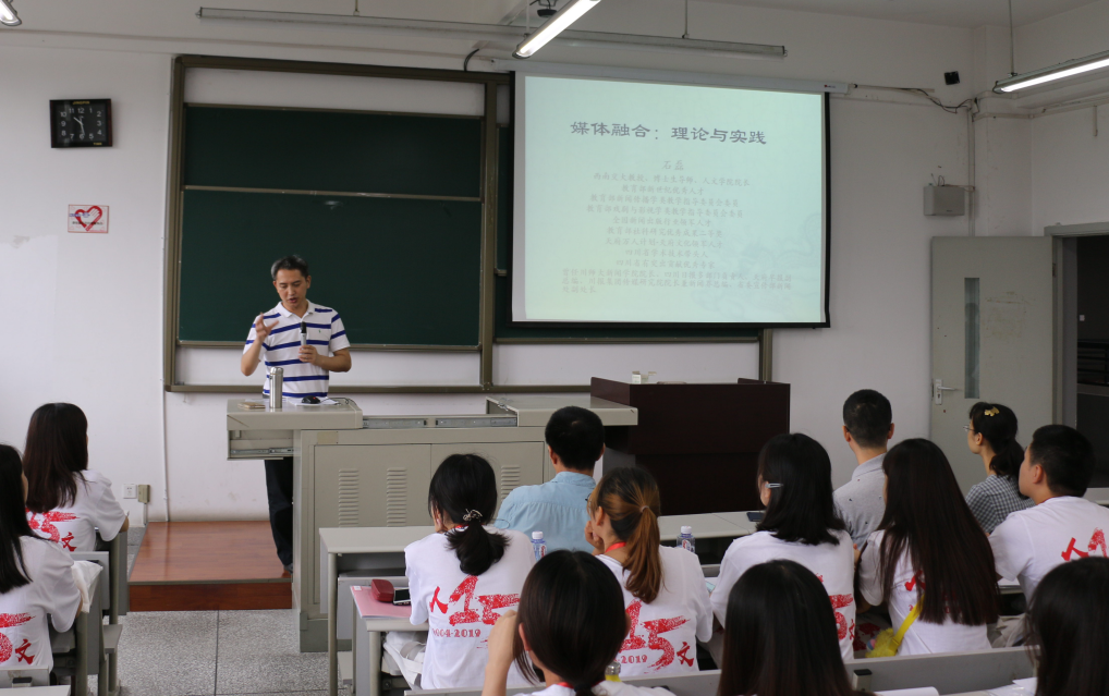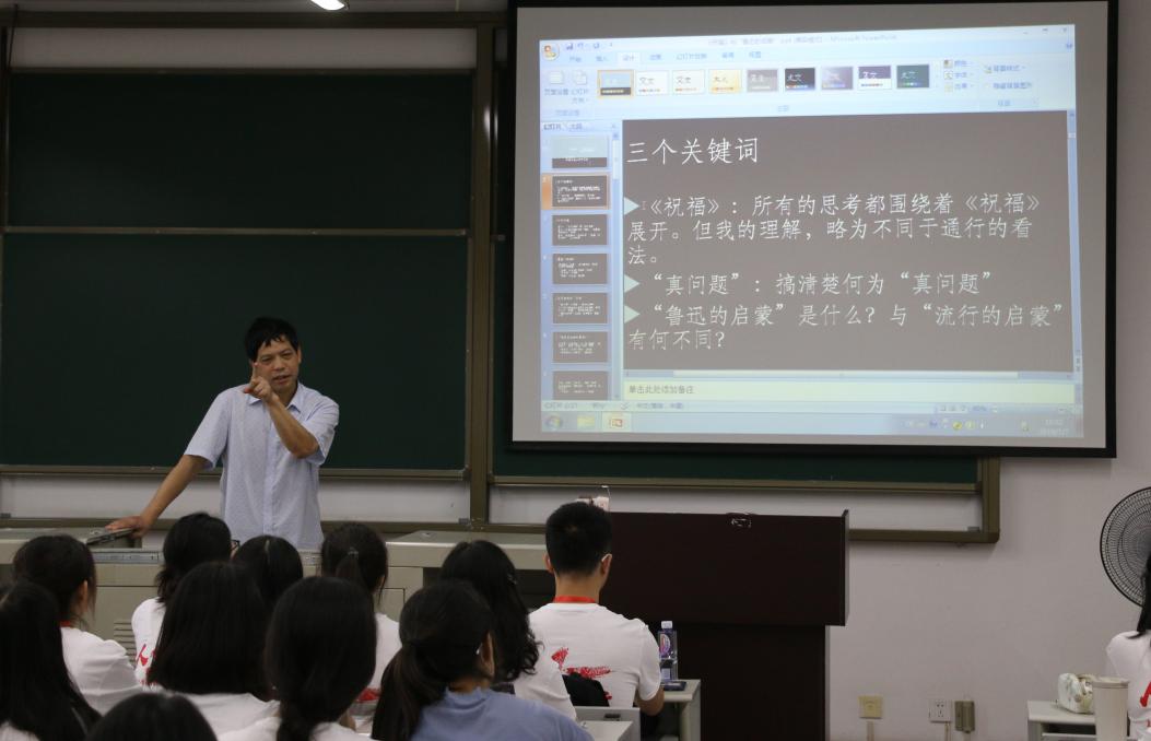 开营仪式完毕后全体夏令营同学和学院老师们合影,随后上午10点至12点在X8522和X8523教室分别进行了两场学术讲座——中文系段从学教授主讲的《<祝福>:“真问题”与鲁迅的“思想”》和传播系石磊教授主讲的《媒体融合:理论与实践》。两位教授在相应的研究领域均取得了重大成果,这一次的学术讲座容纳精粹,充分调动了营员们探讨的积极性,展示了现当代文学和新闻传播学的思辨和创新魅力。